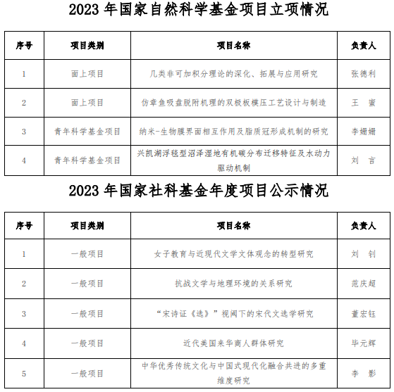 近日,国家自然科学基金委和全国哲学社会科学工作办公室陆续发布了《关于2023年国家自然科学基金集中接收申请项目评审结果的通告》和《关于2023年国家社科基金年度项目和青年项目立项名单的公示》,我校共获9项国家级项目立项,其中国家自然科学基金项目4项,包含面上项目2项,青年科学基金项目2项;国家社科基金一般项目5项。