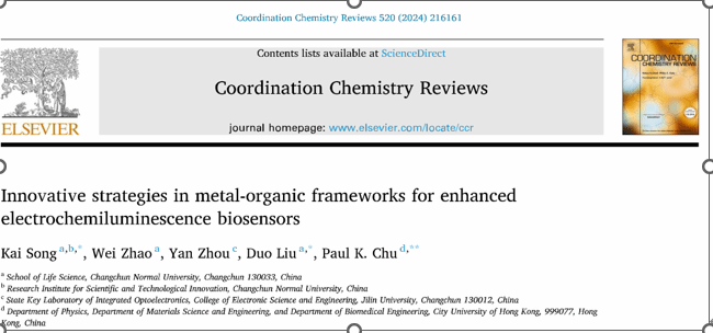 近日,由我校生命科学学院宋凯教授为第一作者,我校刘多教授和香港城市大学Paul K Chu教授为通讯作者的论文——“Innovative Strategies in Metal-Organic Frameworks for Enhanced Electrochemiluminescence Biosesensors”发表于国际权威期刊《Coordination Chemistry Reviews》,该期刊为中科院一区TOP期刊,本年度影响因子为20.3。