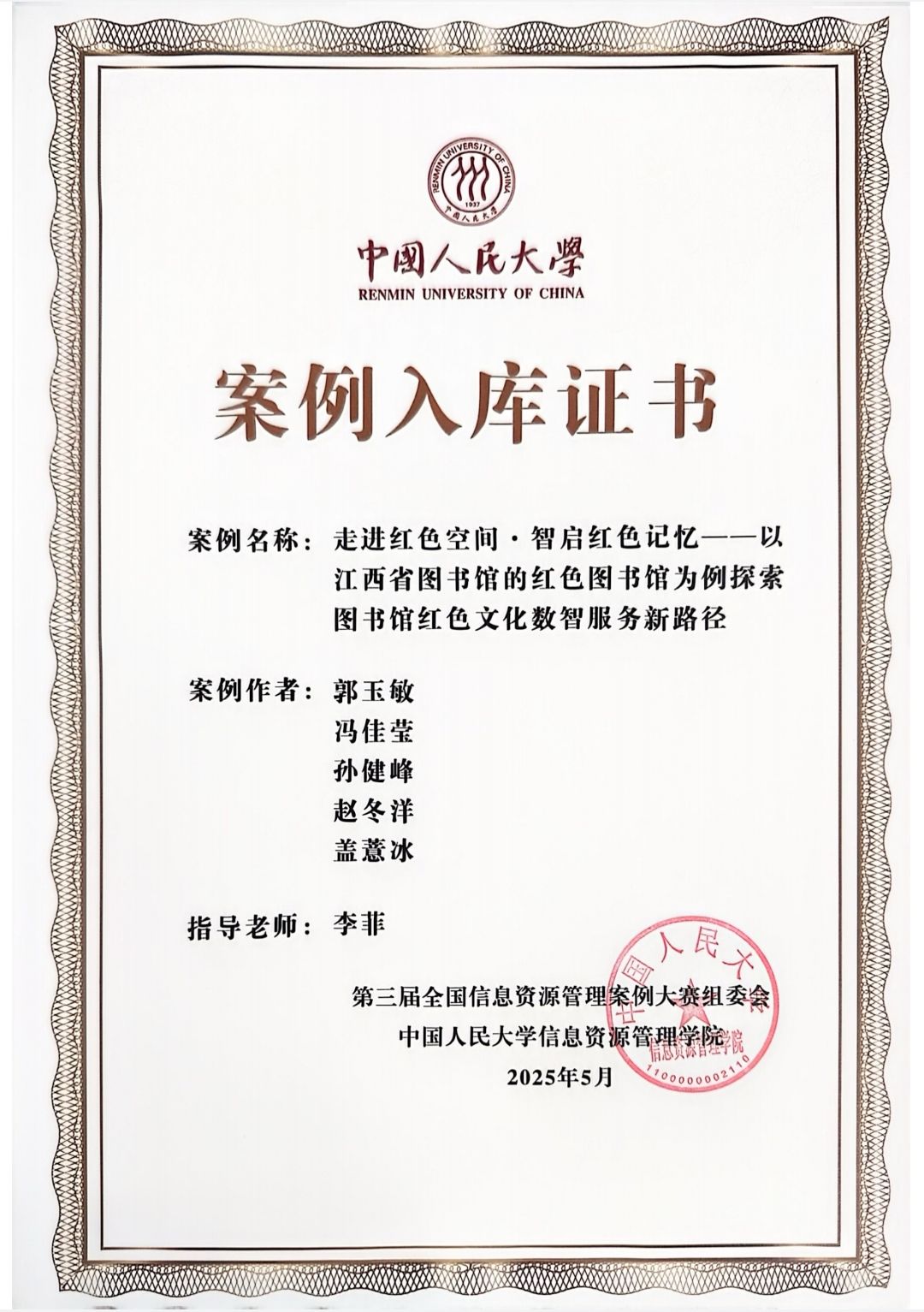 近日,在由中国人民大学信息资源管理学院主办的第三届全国信息资源管理案例大赛中,由政法学院教师李菲指导,郭玉敏、冯佳莹、孙健峰、赵冬洋、盖薏冰等同学共同完成的创新案例《走进红色空间·智启红色记忆——以江西省图书馆的红色图书馆为例探索图书馆红色文化数智服务新路径》,首次成功入选大赛案例库并荣获案例收录证书。